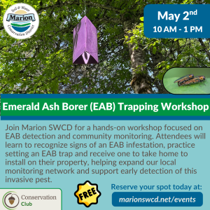 Join Marion Soil and Water Conservation District for a hands-on workshop focused on Emerald Ash Borer detection and community monitoring. Participants will receive a brief overview of EAB, learn how to recognize signs of an EAB infestation, and hear updates on local trapping efforts underway in Marion County. Attendees will practice setting an EAB trap and receive one to take home and install on their property, helping expand our local monitoring network and support early detection of this invasive pest.