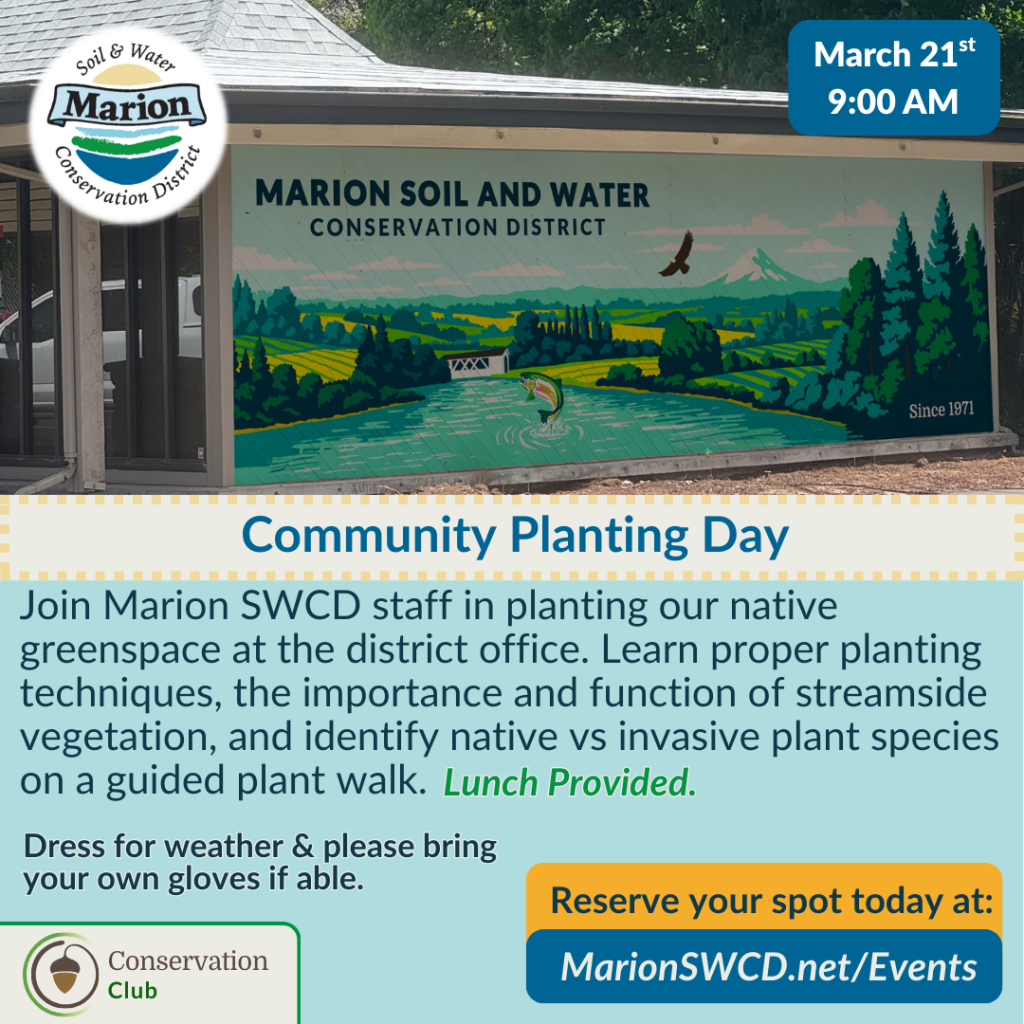Partners: Willamette Riverkeeper, Marion SWCD, Cherriots, Oregon State Parks, City of Keizer, Salem Audubon Society, Claggett Creek Watershed Council, Loren’s Sanitation, REI, Mid-Valley Garbage and Recycling