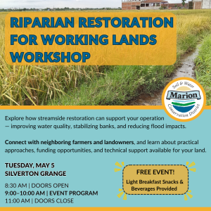 If you have questions about this event, need special accommodations to participate or are interested in riparian restoration for working lands, please contact the event coordinators and district agricultural conservation planners, Becky Pineda – Pasture and Livestock at becky.pineda@marionswcd.net , 503-949-1518, or Cesar Zamora – Soil and Croplands, at cesar.zamora@marinoswcd.net, 971-372-1341.