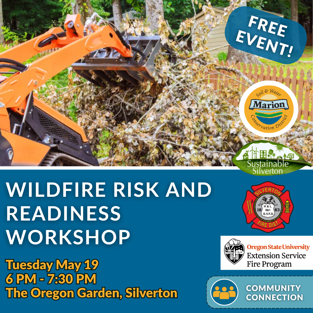 Marion SWCD is proud to partner with Sustainable Silverton, OSU Extension, and Silverton Fire District to host a Wildfire Risk and Readiness Workshop at the Oregon Gardens aimed at presenting key wildfire preparedness practices including emergency preparedness, defensible space, and how to work with your community to reduce wildfire risk including the use of FireWise as a preparedness tool.
