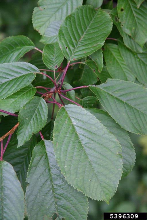 | Look Alikes | Bird cherry can be confused with the native bitter cherry and chokecherry. Both native cherries are much smaller in stature, topping out at 20-30'. The cherries of both are smaller, and in the case of chokecherry, they grow in long elongated clusters with purple-to-black fruits. Bird cherry leaves also have glands at the base of the leaf (small bumps on either side where the stem meets the leaf) that are much larger than those on the native cherries. |