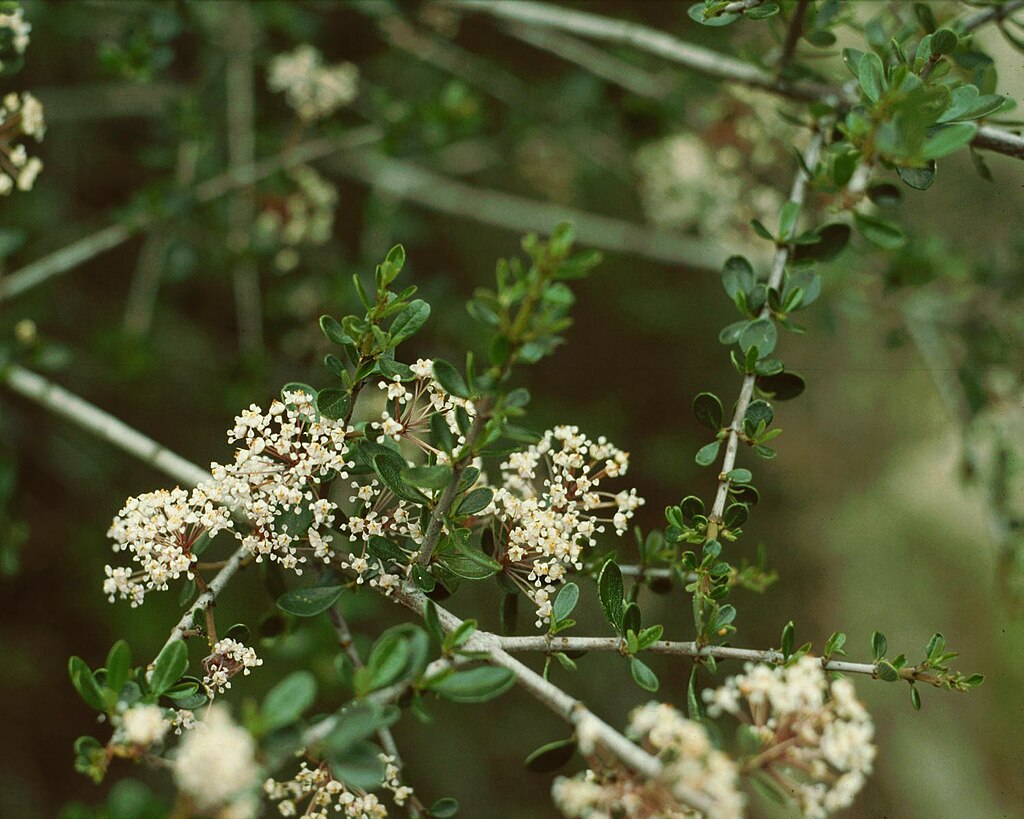 Buckbrush is a tough, evergreen shrub native to dry slopes, chaparral, and open woodlands of California and southern Oregon. It typically grows 3–12 feet tall with dense, rounded branching and small, wedge-shaped, leathery leaves. In early spring, it produces abundant clusters of tiny, sweet-smelling white to pale lavender flowers that are highly attractive to moths, bees, butterflies, and other pollinators. Ecologically, buckbrush is an important nitrogen-fixer, enriching poor soils, stabilizing slopes, and providing critical forage and cover for wildlife in fire-adapted ecosystems. Its drought tolerance and role in supporting biodiversity make it a key species in chaparral and foothill plant communities, as well as a great addition to hedgerows and fencerows.