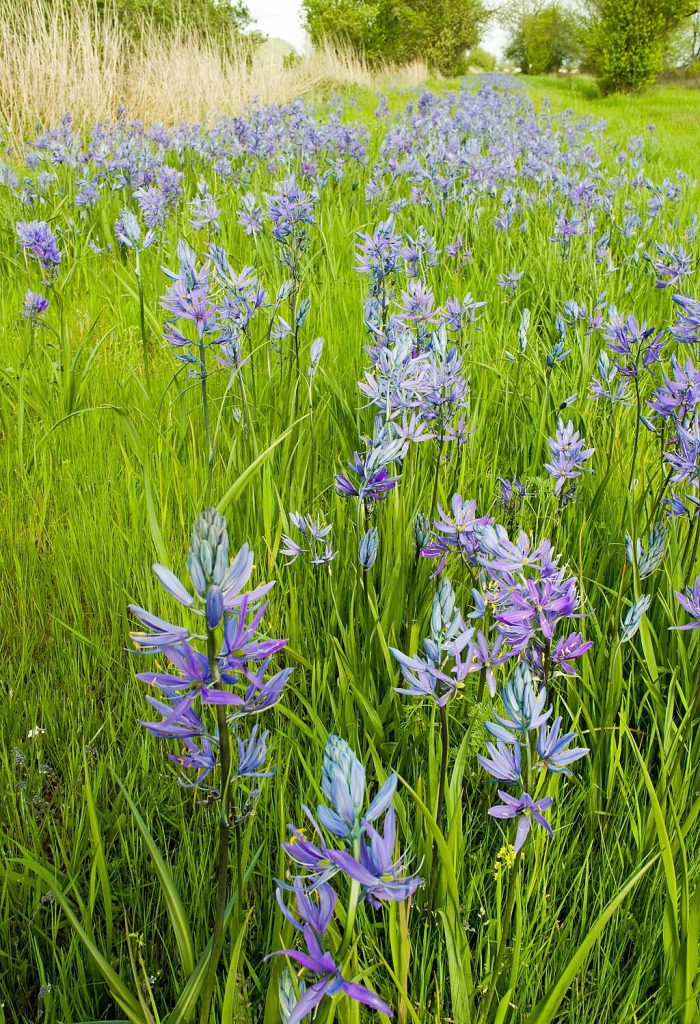 Great camas is a perennial bulb native to moist meadows, prairies, and open woodlands of the Pacific Northwest. It produces tall flowering stalks, often 2–4 feet high, topped with showy racemes of star-shaped deep blue to violet flowers that bloom in late spring to early summer. After flowering, it forms seed capsules while the strap-like leaves wither as the soil dries. Great camas has deep cultural significance—native peoples of the region traditionally harvested the starchy bulbs as a staple food. Today, it remains a key species in wet prairie restoration, an important symbol of cultural identity, and a striking feature of native plant gardens. It can form a beautiful sea of blue/purple in oak savannahs and oak woodlands where it attracts pollinators, butterflies, and hummingbirds.