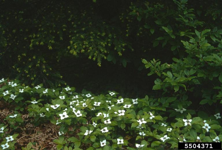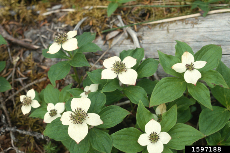 Western bunchberry is a low-growing, rhizomatous perennial in the dogwood family, native to moist forests and coastal regions of the Pacific Northwest. It forms dense mats of glossy, oval leaves and produces large white flowers resembling a miniature dogwood blossom in late spring to early summer. By late summer, it bears bright red berries that provide food for birds and small mammals. Western bunchberry is an important understory groundcover, stabilizing soil and supporting forest biodiversity in cool, shaded, and moist habitats. It’s also a great addition to a shaded woodland garden.