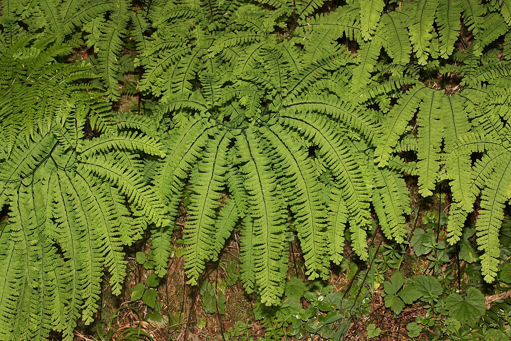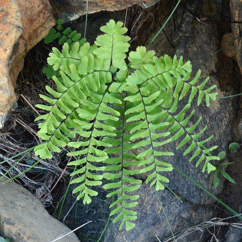 Western maidenhair fern is a delicate yet resilient fern native to moist, shaded habitats across western North America. It is easily recognized by its graceful, fan-shaped fronds divided into small, bright green leaflets that fan out along dark, wiry black stems. Often found on rocky slopes, near waterfalls, or along streambanks, this fern thrives in cool, high-humidity environments. Its refined appearance and preference for stable, damp conditions make it both an indicator of healthy forest ecosystems and a favored species in native shade gardens. It goes dormant during hot dry spells.