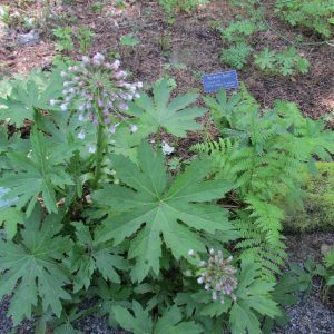 Oval, somewhat dentate leaves and a cluster of small white, fuzzy-looking flowers